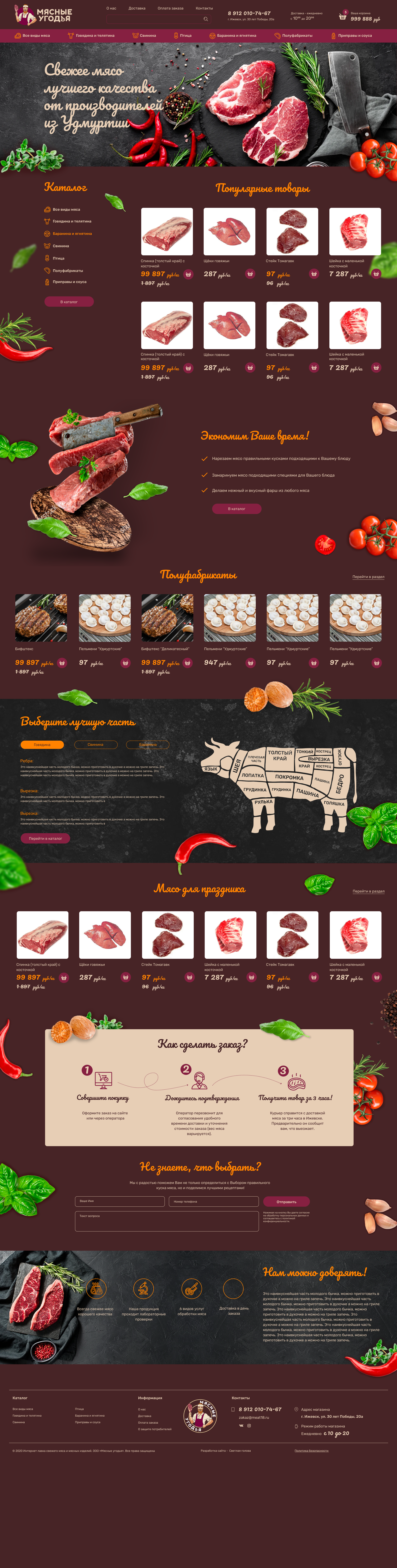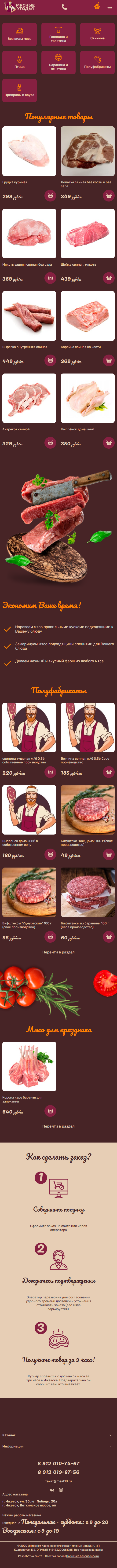 Они предлагают охлажденное мясо только первого и высшего сорта удмуртских производителей. А это - баранина, говядина, телятина, свинина, мясо птицы (цыплята, индейка, гуси, утки), крольчатина.