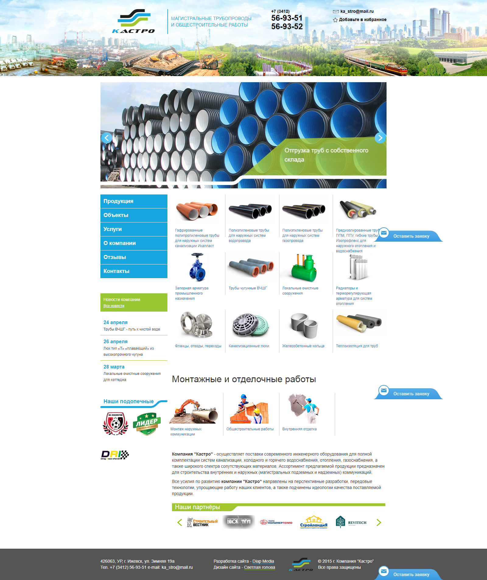 Компания “Кастро” занимается поставками и продажей всех необходимых комплектующих для прокладки инженерных коммуникаций, в том числе канализации, водоснабжения, отопления и газопровода. В наличии на складах компании “Кастро” есть как продукция для внутренней прокладки коммуникаций, а также для наружных трубопроводов. Кроме всего прочего, специалисты компании “Кастро” оказывают услуги по проведению общестроительных работ, внутренней отделке и монтажу наружных коммуникаций.